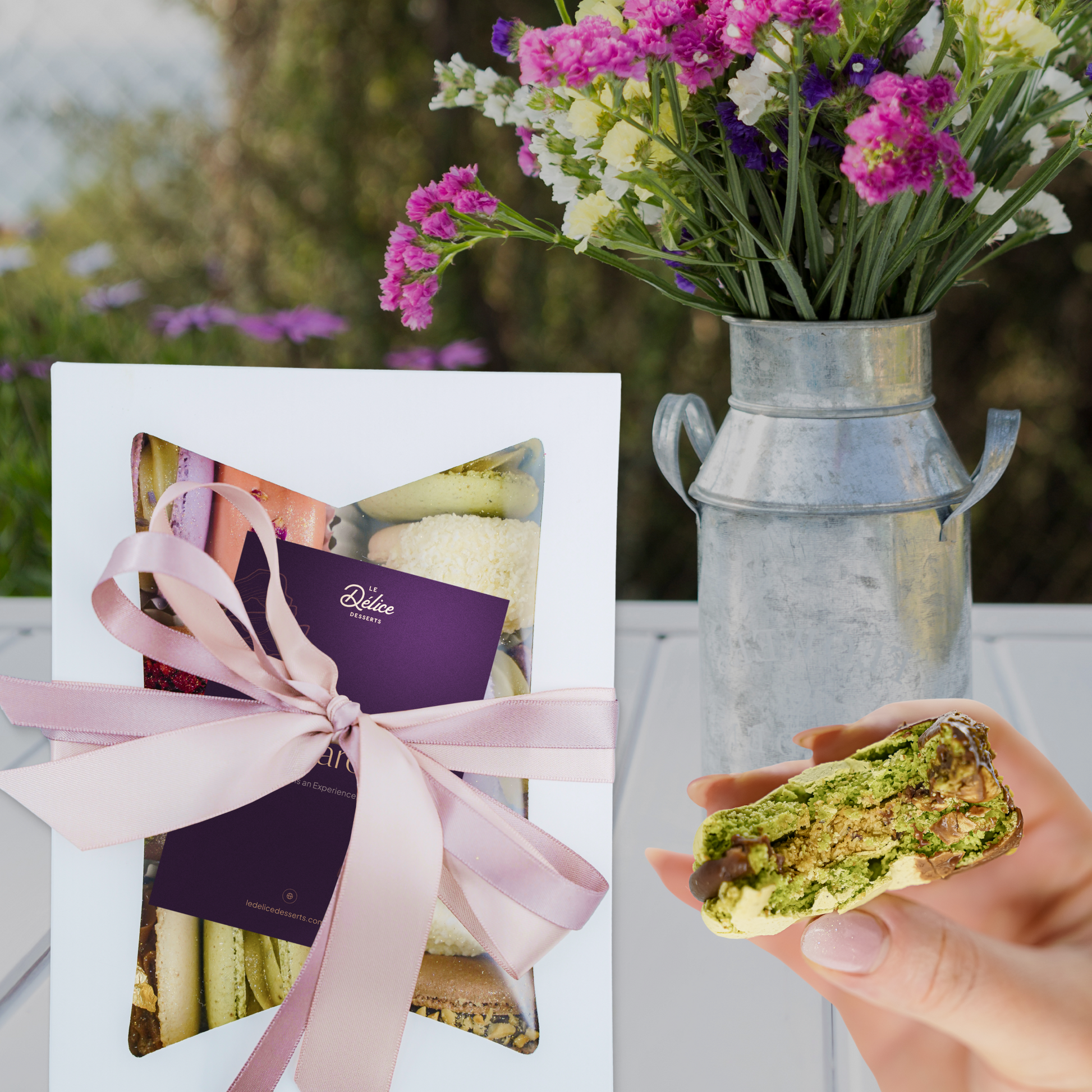 Treat yourself or someone special to the refined flavor of our Pistachio Macarons by Le Délice.