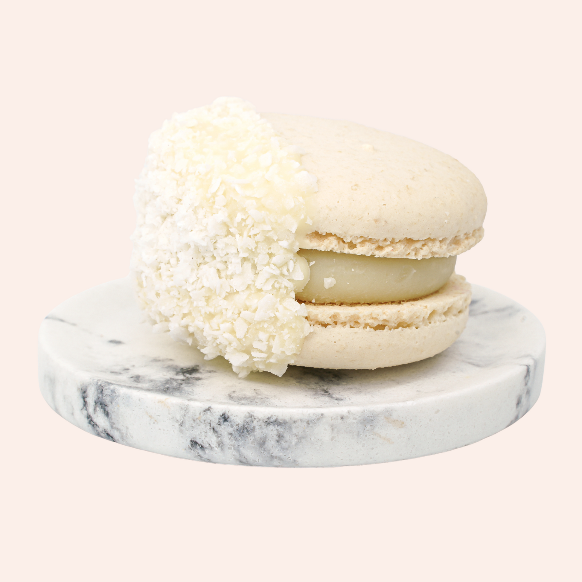 Inspired by the flavors of creamy coconut confections, these delicate French cookies are made with coconut cream, almond butter, and white chocolate ganache, delivering a smooth and luxurious bite with a hint of vanilla.